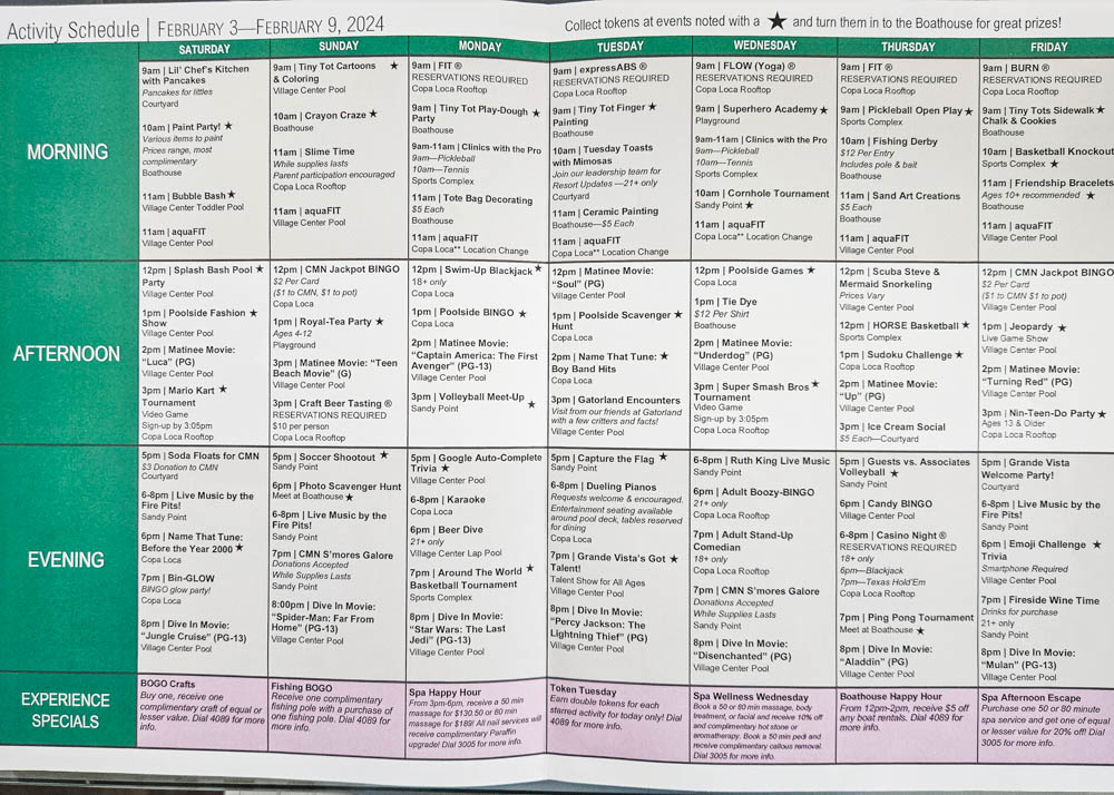The activities schedule shows all the resort’s planned social events, poolside fun, kids’ programs, and health and wellness activities. If you are staying at the resort for a number of days, there will be tons of activities to keep the whole family occupied!